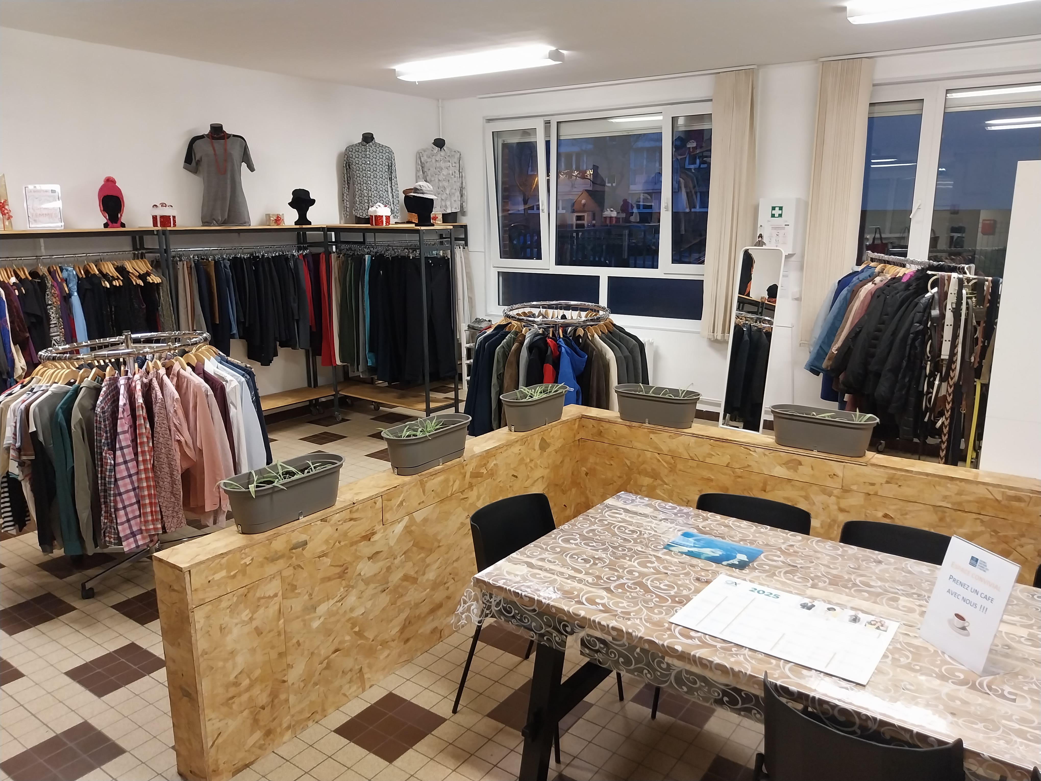Un espace de vente solidaire : Principalement un espace vêtements et, en fonction des besoins locaux, complété par d’autres articles ainsi que des services solidaires : bibelots, petite brocante, espace bien-être, ateliers maquillage ou relooking, retoucherie, service multimédia…